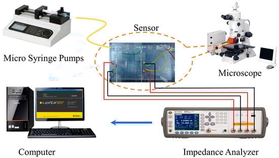 To evaluate the sensor’s overall performance, an experimental setup was built, as shown in Figure 4. The syringe pump was employed to deliver oil to the sensor at a constant flow rate, allowing for real-time observation of the sensor’s operation and the characteristics of impurities through the microscope. The impedance analyzer was utilized to provide excitation to the sensor and collect data for transmission to the computer. Subsequently, the computer was responsible for collecting and analyzing the data. For the experiment, the syringe pump was connected to the sensor oil inlet through a rubber tube, the sensor was placed under the microscope, the four detection units of the sensor were connected to the impedance analyzer through wires, and the impedance analyzer was connected to the computer. This experimental platform can be utilized to test various types of pollutants present in the oil.