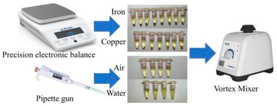 The steps of experimental sample preparation are shown in Figure 5. Before adding 100 mL of oil, 15 mg of iron and copper particles (Hebei Leber Metal Material Technology Co., Ltd., Xingtai, China) of different sizes were measured with a precision balance. The samples were then thoroughly mixed by subjecting them to oscillation at 2500 rpm for 30 min using a vortex mixer. A pipette gun was used to take water and air into the oil solution, and then the vortex mixer was used to mix the sample, and the size of water droplets and air bubbles was controlled by controlling the oscillation time.