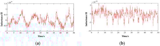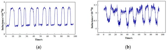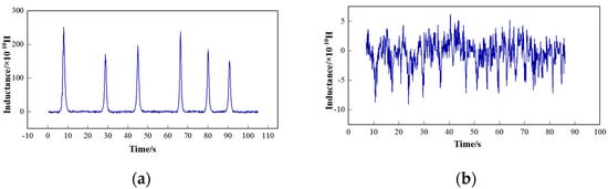 The main purpose of inductive mode detection is to identify metal particles in oil. Two inductive coils were linked to the impedance analyzer. Based on previous research [24,25], the impedance analyzer’s frequency and excitation voltage were set at 2 MHz and 2 V, respectively. To account for the impact of oil overflow speed on detection accuracy [24], the flow rate of the micro syringe pump was adjusted to 480 µL/min. The experiment utilizes mixed samples along with different inductive coils. The detection results for different sizes of metal particles are shown in Figure 6 and Figure 7.