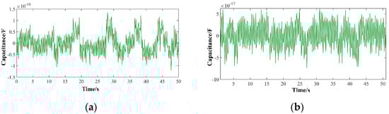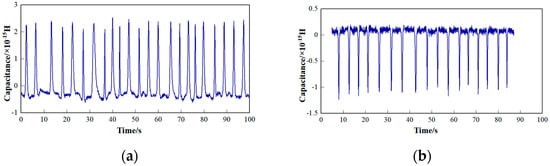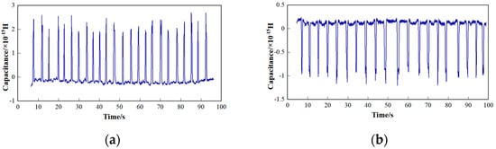In the earlier study [32], the capacitive sensing unit was operated at an excitation frequency of 1.8 MHz. The excitation voltage and syringe pump flow rate were also set to match the inductive mode. Experiments were carried out using samples that were prepared beforehand. Figure 8 and Figure 9 display the results of detecting different capacitances for various sizes of non-metal particles.