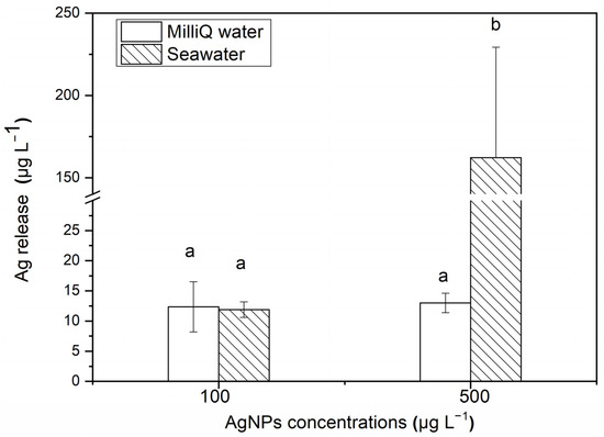 After 24 h, the release of soluble Ag from AgNPs in Milli-Q water and seawater. The same identification letter (e.g., a and a) represents no significant difference, while different identification letters (e.g., a and b) represent a significant difference.