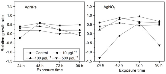 The effects of different concentrations of AgNPs and soluble Ag concentrations (10, 100, and 500 μg·L−1) on the relative growth rate of S. costatum at 24, 48, 72, and 96 h.