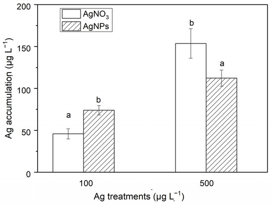 The Ag accumulation in algae exposed to soluble Ag and AgNPs for 48 h. The same identification letter (e.g., a and a) represents no significant difference, while different identification letters (e.g., a and b) represent a significant difference.