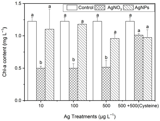 The evolution of the Chl-a content in algae exposed to different concentrations of ionic Ag and AgNPs for 48 h. The same identification letter (e.g., a and a) represents no significant difference, while different identification letters (e.g., a and b) represent a significant difference.