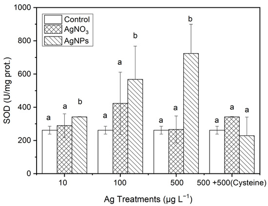 From Figure 7, it can be seen that, after 48 h of exposure to Ag solutions with different concentration gradients, the SOD contents in the algae in the AgNP treatments were 1.17, 0.34, and 1.72 times higher than those in the ionic Ag treatments for 10, 100, and 500 μg·L−1, respectively. However, the SOD contents in S. costatum in the equal amount of cysteine addition treatments, there was no significant difference between the control and the two forms of Ag treatment.