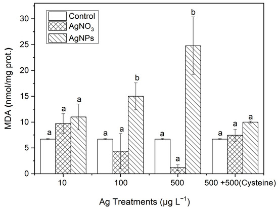 The evolution of the MDA content in algae exposed to different concentrations of soluble Ag and AgNPs for 48 h. The same identification letter (e.g., a and a) represents no significant difference, while different identification letters (e.g., a and b) represent a significant difference.