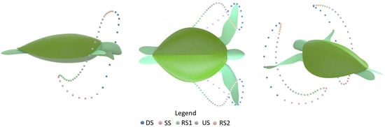 During the turtle’s regular swimming routine, van der Geest et al. [] documented that the rear flippers are seen to tuck in behind the carapace with the flipper tips pointing backwards and near motionless as per Figure 7. Our CFD and field test results show that towards the rear of the carapace, the flow detaches from shell to create a low energy zone directly where the rear flippers are positioned (Figure 7c,d and Movie S8). This volume of low energy flow helps lower the form and friction drag on the turtle’s rear flippers, thus improving the animal’s drag coefficient for the gliding stage. This also helps explain why the flippers remain almost motionless, as any changes to the flipper’s position within this low energy zone may not generate any significant directional control for the turtle.