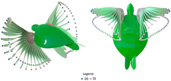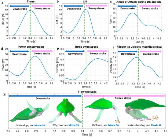 As observed in Figure 5, all test results for thrust, lift, AoA, power, swim speed, and flipper tip velocity are detailed for the sea turtles DS and SS, with the corresponding flow features observed at each time interval detailed in Figure 5g. All tests were performed with the flapping frequency remaining constant at 0.23 Hz based on the average flapping observed in wild green sea turtles [,,].