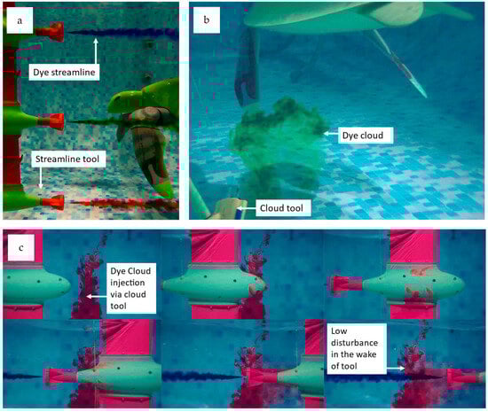 Dye visualisation tools. (a) Streamline tool in use. (b) Cloud tool in use. (c) Streamline tool wake disturbance testing. Also, see Movie S3.