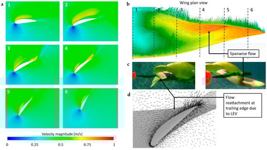 Downstroke flow features. (a) Velocity plots from various cross-sections along the turtle’s wingspan from CFD. The numbers 1–6 in the top left of each cross-section correlate to the dashed lines shown in Figure 6b. (b) Plan view of the turtle wing showing cross-section locations and velocity streamlines obtained from CFD. (c) Dye visualisation testing shows flow reattachment towards the wing trailing edge and the spanwise flow demonstrated by dye being transported towards the wing tip. (d) Vector plot from CFD showing flow reattachment.