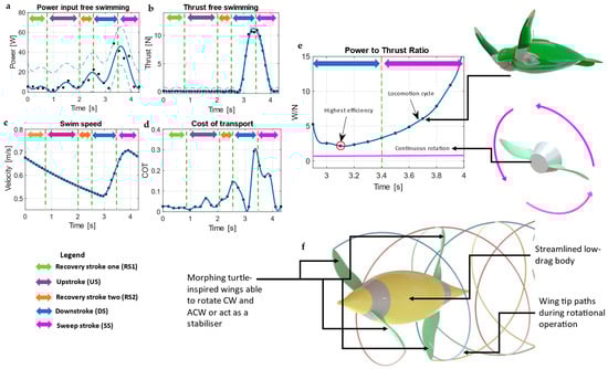 As observed in Figure 8, the power consumption, thrust production and swim speed data are plotted from the experimental swimming tests for the complete swimming cycle. Additionally, a curve of input power (Figure 8a) divided by output thrust (Figure 8b) is displayed for the down- and the sweep strokes in Figure 8e with the cost of transport () for the complete swimming cycle detailed in Table 1 and plotted against time in Figure 8d. The cost of transport was calculated with