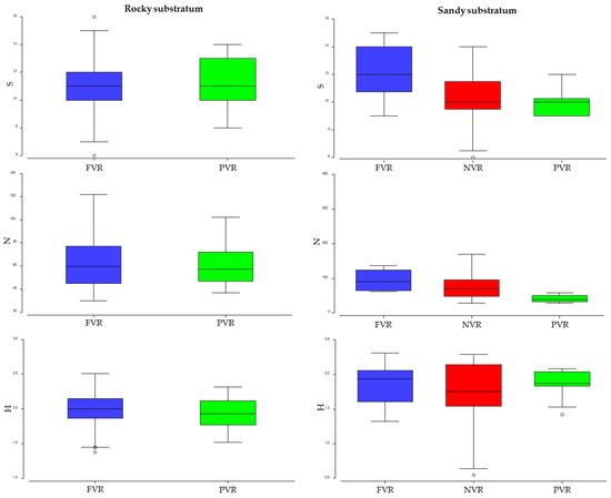 Boxplot of the significant differences between diversity indexes for rocky and sandy substratum for the levels of the factor ‘Vermetid status’. Comparison circles displays whether or not the mean values are significantly different from each other.