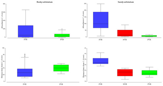For sandy substratum, we recorded a different scenario (Figure 3). Indeed, the highest quantities of C. chromis were observed within FVR sites, with the fish schools occurring at significantly higher distances from the shore. For all the sites characterised by a PVR or a NVR reef, we recorded low quantities of damselfish schools occurring in near proximity to the shore (Table 7, Figure 3).