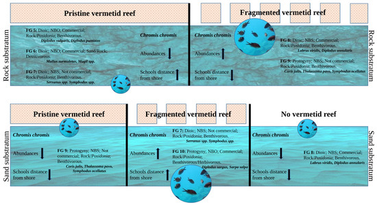 Schematical representation of the two landscapes studied under the condition of rock and sandy substratum with the different levels of fragmentation of the vermetid reef. For each reality are listed the Functional Groups (FGs) with significantly greater quantities with the specific traits and the fish species included. The quantities of C. chromis are also schematically represented through bubbles.