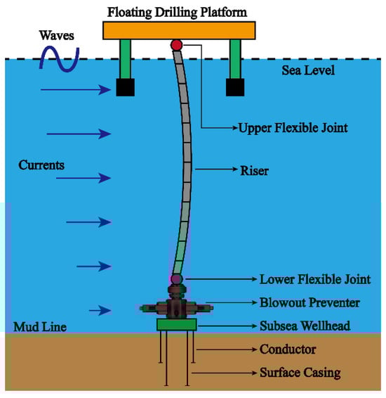Figure 1. The system of the floating drilling platform–riser–BOP–subsea wellhead.