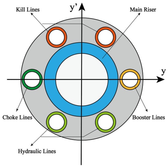 The auxiliary pipelines mainly include kill lines, hydraulic lines, choke lines, and booster lines. The function of the choke and kill lines is to reduce the pressure loss caused by fluid flow in the riser. The booster line, which is connected with the mud pump on the floating platform, is used to increase the flow rate of the drilling fluid in the riser. The hydraulic pipelines are used to control the BOP in drilling engineering [60]. The distribution of the main riser pipe and auxiliary pipelines are shown in Figure 2.