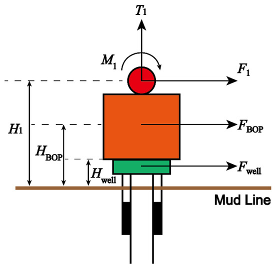 where FBOP is the current force on the BOP, N; HBOP is the height from the mud line to the center of gravity of the BOP, m; F1 is the current force on the lower flexible joint, N; H1 is the distance between the mud line and the lower flexible joint, m; M1 is the bending moment on the subsea wellhead transmitted from the riser, N·m; Fwell is the current force on the subsea wellhead, N; Hwell is the sludge height of the subsea wellhead, m.
