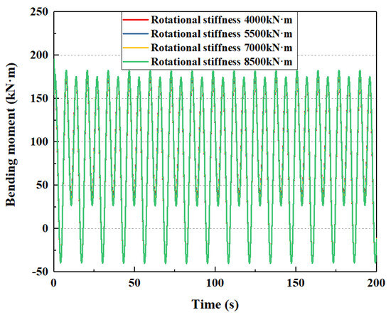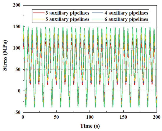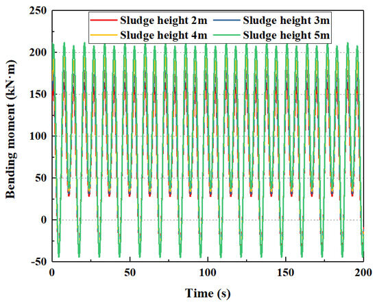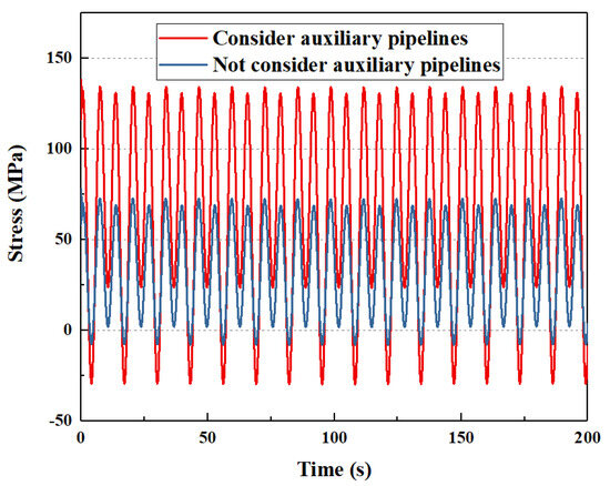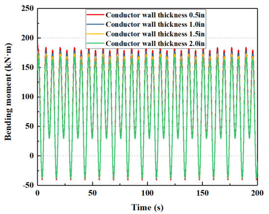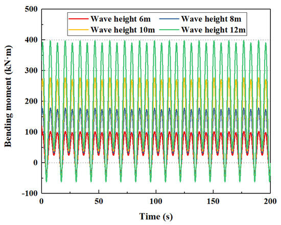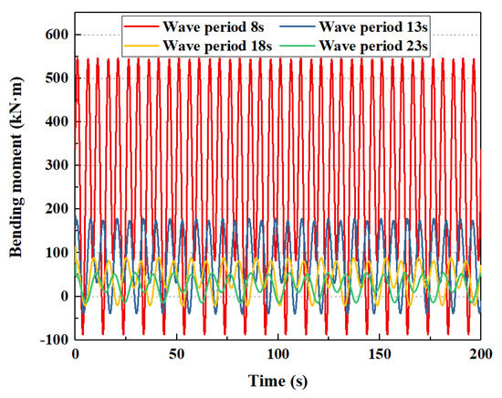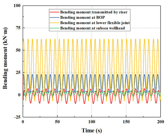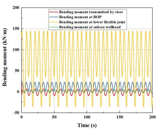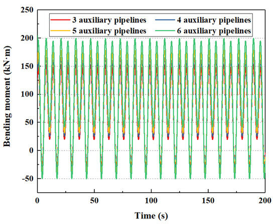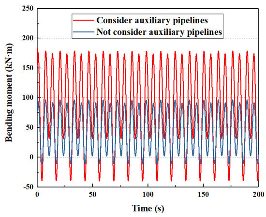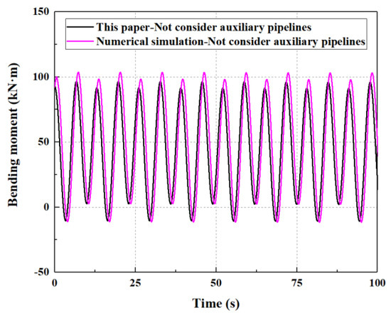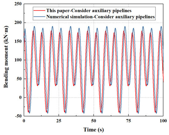 The results show that, if the auxiliary pipelines are considered, the maximum bending moment is 178.5 kN·m calculated by the method proposed in this paper, while the maximum bending moment is 190.5 kN·m calculated by the numerical simulation. If the auxiliary pipelines are not considered, the maximum bending moment is 96.6 kN·m by the method proposed in this paper, while the maximum bending moment is 103.6 kN·m by the numerical simulation. If the auxiliary pipeline of the riser is considered, the error between the theoretical results and the numerical simulation is about 6.7%, while the error between the theoretical results and the numerical simulation is about 7.2% if the auxiliary pipelines are not considered. Additionally, the results between the numerical simulation and the theoretical calculation have the same order of the amplitude, and the oscillation periods between the numerical simulation and the theoretical calculation are the same. Therefore, the correctness of the model proposed in this paper has been verified.