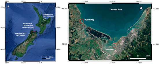 Damage data collection for Extra-Tropical Cyclone Fehi (CF2018) was concentrated on the settlements of Ruby Bay (Tasman District) and Monaco (Nelson City) (Figure 1). On-site assessments were consistent for the E2017 and WP2021 events (Table 1). Building attributes included construction period, dwelling type, structural frame, floor height, foundation type, number of storeys and wall cladding (refer to Table 2). In addition, building roof outline area was measured in GIS. These attributes were categorised as nominal or ordinal or as continuous data structures.