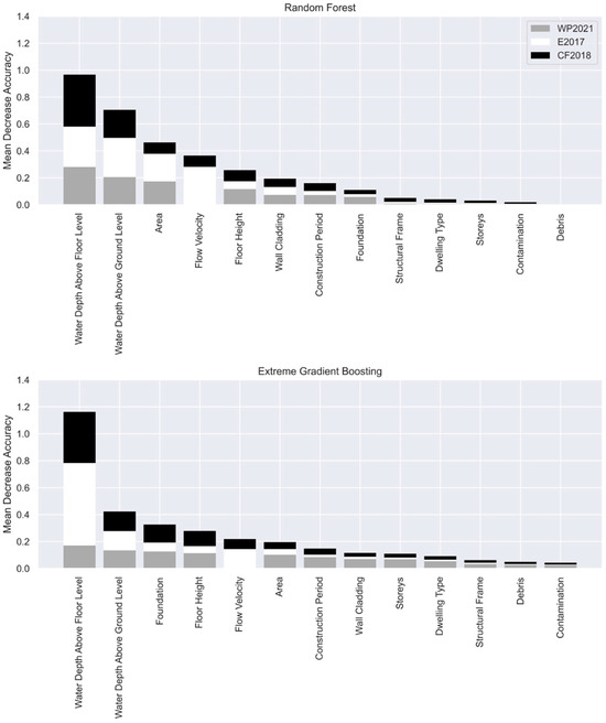 The relative importance of explanatory variables for the relative damage returned by RF and XGB models is presented in Figure 2. The models demonstrated the high importance of water depth above floor level and ground level as causative factors for building damage across all flood events. This is consistent with the global literature indicating water depth being a principle explanatory variable for building damage (e.g., [5]). Water depth above floor level showed a higher influence on damage, which can be attributed to damage to non-structure components (e.g., internal finishes) located at or above floor level and with a high susceptibility to damage upon water contact [16]. The presence of flow velocity on damage was observed for events E2017 and CF2018. Despite comparatively fewer observations (n = 13), the variable had a relatively high influence on building damage. The limited observations indicated that conditions causing damage were highly localised. Debris and contamination showed little influence on building damage for the studied events. This could be influenced by high material susceptibility to damage on water contact across all flood sources.