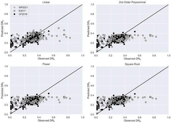 Univariable models established a correlation between DRb and the water depth measured above ground level. Several regression models, including linear, power, second-order polynomial and square root functions, were employed to ascertain the relationship between water depth and DRb. These regression models were trained and assessed for their ability to predict DRb. Nominal hazard variables, such as flow velocity, were not considered in these univariable regression models.