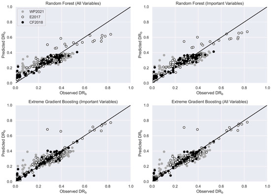 Higher DRb prediction precision was observed for RF and XGB models compared to the univariable models investigated (Figure 4). MSE and MAE precision increases of over 40% were observed for multivariable models compared to square root and second-order polynomial regression. Such improvements in model predictions are visualised in Figure 4, whereby observed and predicted DRb returned by multivariable regression models demonstrate closer proximity to the 1:1 identity line compared to univariable models in Figure 3. Across all flood events, models learned on important explanatory variables for damage demonstrated higher precision than models considering all variables. This suggests that a larger explanatory variable range may cause model overfitting for damage prediction [14], highlighting a need to replicate local damage factors for reliable damage model applications.
