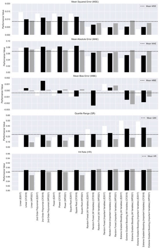 The event damage predictions for univariable and multivariable models compared to observations are presented in Figure 3 and Figure 4, respectively. For consistency with international studies [5], univariable models predicted DRb in response to water depth above ground level. Square root and second-order polynomial regression demonstrated the highest prediction precision and reliability overall for the univariable models tested (Figure 5). Precision in terms of MSE and MAE was slightly higher (12% and 15%, respectively) than the linear regression model, the simplest and lowest-performing univariable model. The higher-performing square root regression was consistent with several international studies which observed similar univariable model trends in fluvial flood hazard contexts. Univariable hit rates (HRs) were higher for WP2021, ranging from 0.86 to 0.88, with a relatively lower uncertainty for its QR (0.08 to 0.12) compared to other events. Models for E2017 and CF2018 returned similar HR values but demonstrated larger uncertainties with QR, ranging between 0.18 and 0.23. Prediction uncertainties for these events could be attributed to highly localised flow conditions due to levee-breach failure (E2017) or wave action (CF2018), as indicated by the presence of flow velocity damage. Such conditions were not observed for WP2021, with damage more highly influenced by water depth (Figure 2). Additionally, larger uncertainties for CF2018 DRb predictions could be attributed to the small damage sample (n = 57) for model learning. Here, univariable model predictions demonstrated large variations relative to the 1:1 identity line shown in Figure 3. Model over- and under-prediction represents the inability of simple univariable models to represent the relationship between DRb and water depth above ground level when fewer damage samples are available for model learning.