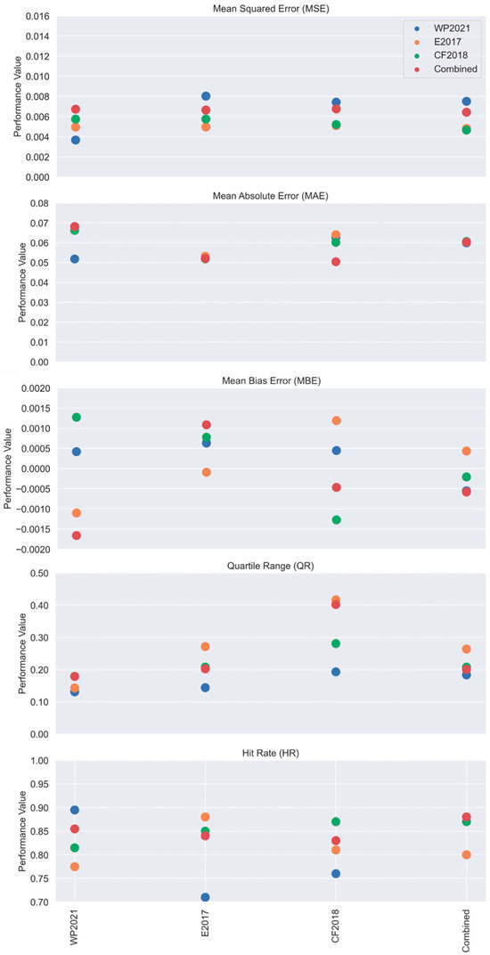 Spatial transfer analysis was performed using the RF model and all explanatory variables across the studied flood events. A combined model learned for damage prediction using the complete WP2021, E2017 and CF2018 datasets was included. Precision and reliability metrics from transfer test models are presented in Figure 6.