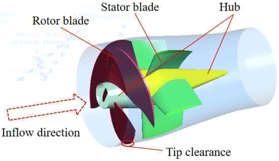 The high-speed water-jet pump mainly consists of two parts: the impeller and the diffuser, which is the main power source of the water-jet system, and its function is to convert mechanical energy into the energy of water flow. The three-dimensional model of the water-jet pump is shown in Figure 1, and its basic parameters are as follows: the shroud diameter of the impeller is D = 210 mm with a 0.2 mm tip clearance. The impeller features three blades, whilst the diffuser contains five. The design speed is n = 6000 r/min and the specific speed is ns = 1850. The simulation calculation domain consists of five parts: the water inlet control body, inlet channel, impeller, diffuser, and straight pipe nozzle section. Since the performance of the high-speed water-jet pump is affected by the incoming flow conditions, the flow field area around the inlet was taken into account in the simulation in this paper, and the length, width, and height of the ship’s bottom water area were 30D, 10D, and 8D [].
