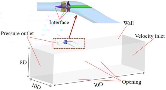 Fluent 2020 R2 software was used to simulate the high-speed water-jet pump numerically, and the SST k–ω turbulence model was adopted. The high-speed water-jet pump’s boundary conditions must be set correctly to ensure reliable calculation results. Figure 2 shows the boundary conditions of a high speed water jet propulsion pump. The inlet surface of the flow field was set as the velocity inlet; the outlet of the inlet control body and the outlet of the straight pipe nozzle section were set as the pressure outlet; the pressure value was 1 atm. The two sides and bottom surfaces of the control body were set as opening boundary conditions, and the other boundaries were set as “no-slip wall” surfaces. In the steady-state numerical simulation calculation, the impeller region was set as the rotating region, and the inlet control body, inlet channel, diffuser, and straight pipe nozzle segment were set as the stationary region. The interface between the dynamic and stationary components was the “frozen rotor interface”. In order to improve the simulation accuracy, in the transient calculation, the steady-state calculation result was taken as the initial field, and the above “frozen rotor interface” was changed to “transient rotor stator”. Two mesh interfaces were formed before and after the impeller to simulate the dynamic and stationary interference flow field. The time step was 0.0005 s, the number of iterations in each time step was 100, and the convergence residual was 10−5.