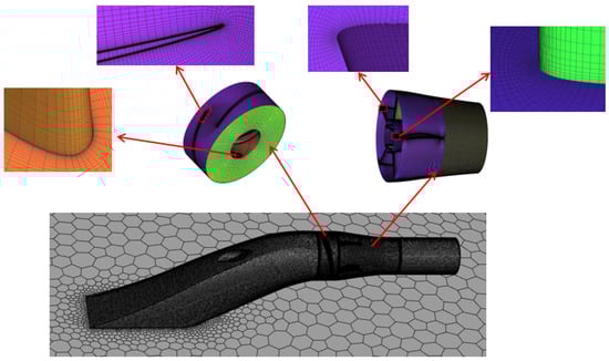 In this paper, the closed governing equation of the Zwart cavitation model [] was adopted, which treats the mixture of water and steam as a combination of numerous vapor bubbles. The volume fraction of the vapor phase is determined by calculating the rate of mass transfer between the vapor and liquid. The condensation term m+ equation and the evaporation term m− equation are expressed respectively as: