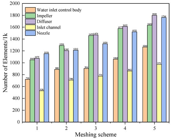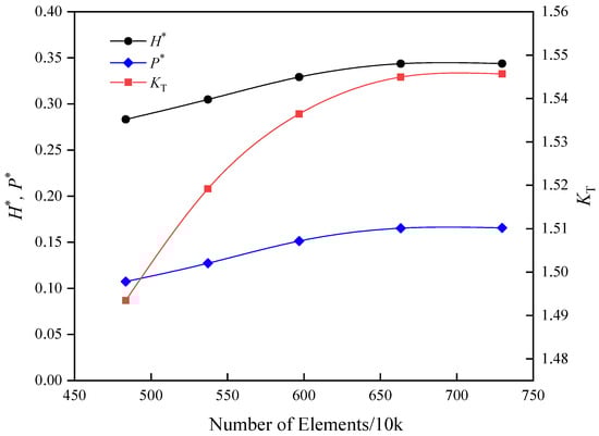 The number of meshes directly affects the accuracy of the numerical calculation results. Generally speaking, a higher number of meshes leads to more precise calculation results of pressure and efficiency. Nevertheless, once the number of meshes surpasses a certain point, it no longer affects the aforementioned parameters. Figure 4 shows the five grid partitioning schemes and details the specific number of grids for each hydraulic component, and Figure 5 shows the variation trend of thrust coefficient KT, head coefficient H*, and power coefficient P* with the number of meshes in the design condition of the water-jet pump (n = 6000 r/min). The thrust coefficient KT, head coefficient H*, and power coefficient P* are defined as follows: