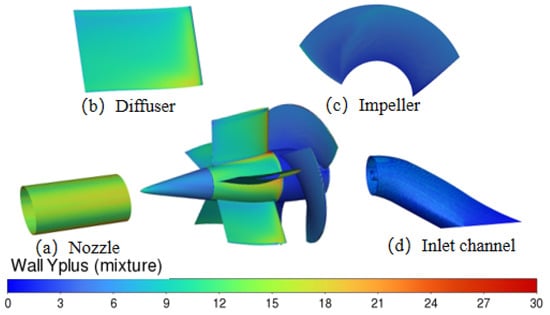 In the process of the CFD calculation, the function of y+ is reflected in the calculation of the height of the first layer of mesh nodes in the process of mesh division, and its size is related to the capture of the viscous bottom layer. As shown in Table 1, the y+ of the impeller, diffuser, inlet channel, and straight pipe nozzle were all within the range [0, 30], with average values of 24.4, 37.81, 22.31, and 36.4, Figure 6 shows the corresponding y+ distribution. respectively, meeting the calculation requirements of the SST k–ω turbulence model.