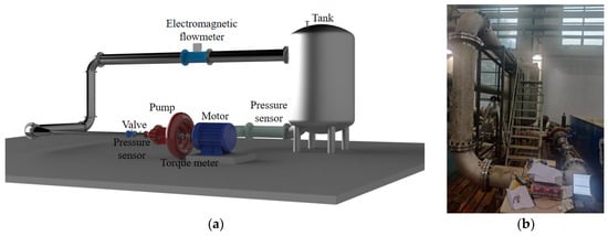 This experiment on external characteristics and cavitation was conducted within a closed experimental system, mainly comprising of a pressure stabilizer tank, booster pump, frequency converter, electromagnetic flowmeter, inlet and outlet pressure measuring pipe, valve, high-speed water-jet pump prototype, circulation pipeline, motor, gear box, pressure transmitter, TPA measuring instrument, etc. The electromagnetic flowmeter was a DN300 E-magC from Kaifeng Instrument Company Limited, with an accuracy of ±0.3%. The pressure transmitter was made up of three Shanghai Welltech WT2000GP models with a measuring range of 0~1.6 MPa, 0~2.5 MPa, and 0~4.0 MPa, respectively, and the maximum allowable error was ±0.1%. The torque and speed sensor of the Hunan Xiangyi torque instrument were selected, the model was XSR21Y-T2B3A1A1MS2V0N, and the accuracy was ±0.05%. The instruments used in the experiment were inspected and reported by the Institute of Metrology Science to ensure the accuracy of the experiment. The experimental system’s principle diagram is shown in Figure 7a while the physical diagram can be seen in Figure 7b.