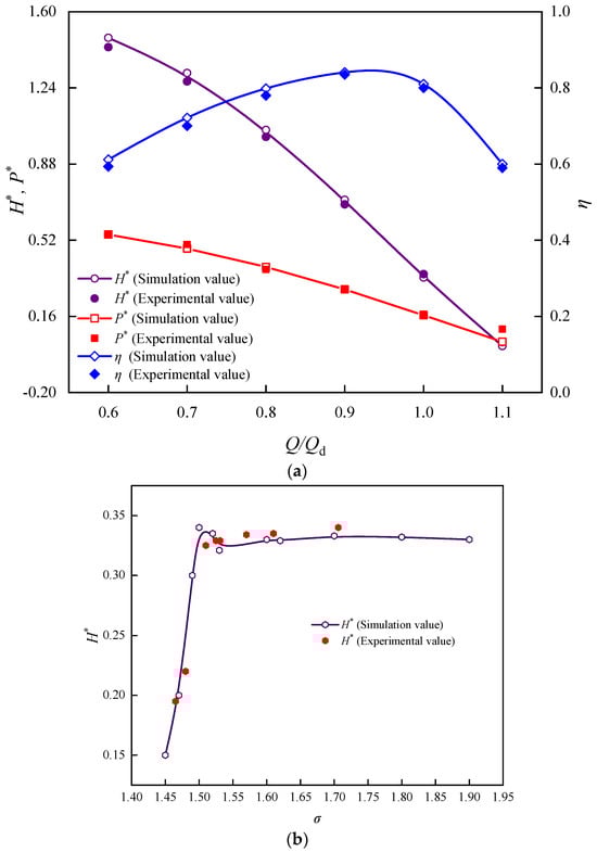 Comparison of the experimental results and numerical simulation results of the water-jet pump. (a) External characteristic curve of the water-jet pump. (b) Cavitation performance curve of the water-jet pump.