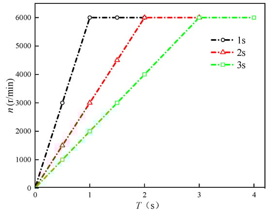 In Figure 9, the start times were 1 s, 2 s, and 3 s, and the speed increased linearly. The speed increased from 0 r/min to 6000 r/min, and after the start-up process was over, the ship ran at the highest speed. In Figure 10, the acceleration times were 0.5 s, 1 s, and 1.5 s, and the speed increased linearly from 3000 r/min to 6000 r/min. After the acceleration process, the ship ran at the highest speed.