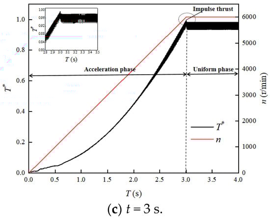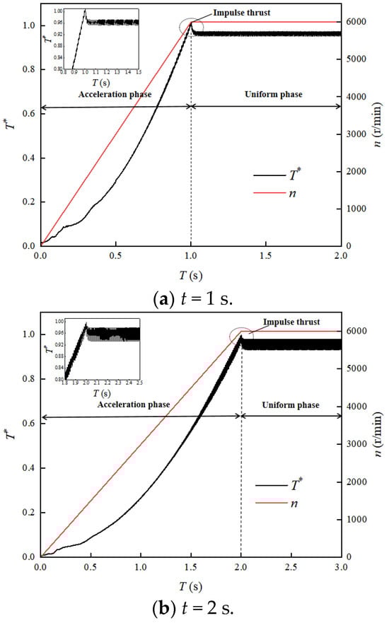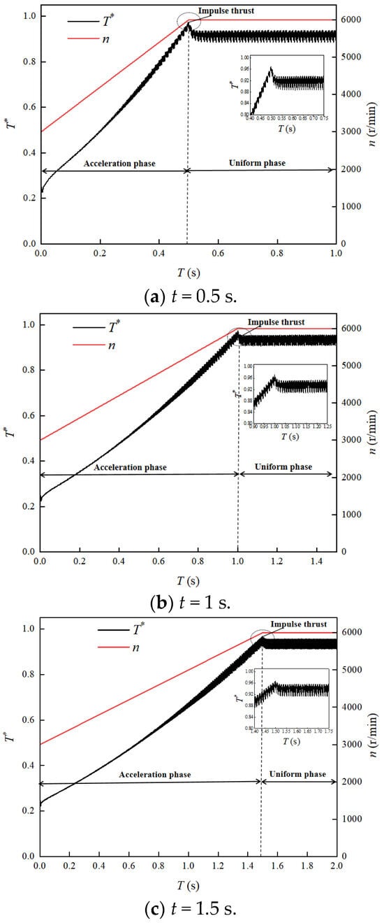 The entire speed change process can be divided into an acceleration stage and a stability stage. In the acceleration stage, the thrust increases rapidly with the increase of the speed. When the speed reaches 6000 r/min, the thrust appears to be significantly greater than the thrust in the stable stage at the moment of the end of the acceleration. In the stable stage, the impact thrust gradually decreases to the stable value. By comparing the thrust characteristics of different acceleration times, it was found that the impact thrust decreased with the increase in the acceleration time, and the impact thrust of 1 s, 2 s, and 3 s was T0, 0.987T0, and 0.981T0, respectively. When the acceleration time was 0.5 s, 1 s, and 1.5 s, the impact thrust was 0.967T0, 0.961T0, and 0.955T0, respectively. This indicates that high acceleration can easily lead to greater impact thrust.