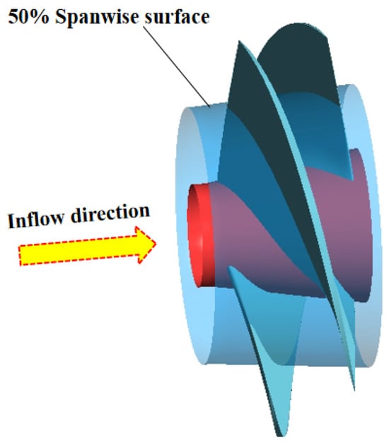 In order to analyze the flow field evolution law of the impeller during the variable speed process, the 50% spanwise surface of the impeller was taken, that is, the middle position of the impeller flow channel, as shown in Figure 13.
