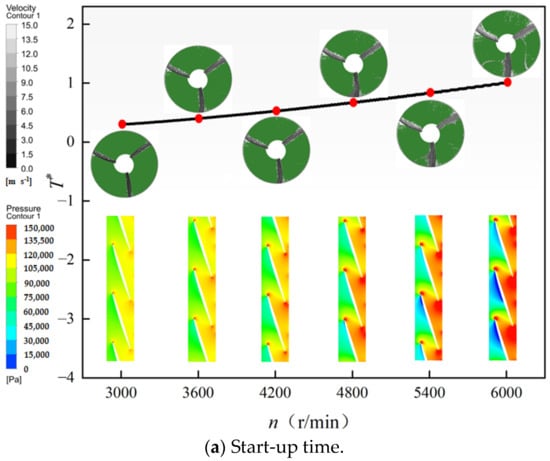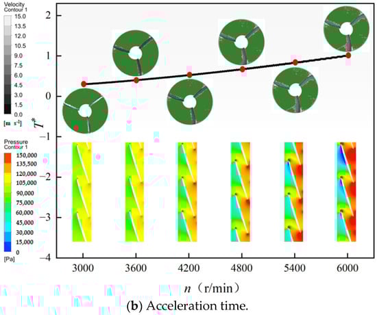 As can be seen from Figure 14, when the acceleration was the same, the velocity distribution and pressure distribution evolution law of the start-up process and the acceleration process were similar. It is unnecessary to go into detail here. By comparing the pressure diagram of the 2 s start-up process and 1 s acceleration process, it can be seen that the high-pressure region of the 2 s start-up process was small, the vortex core region was large, and the ability to do work was weaker. This is because at the same acceleration, the start-up process had stronger hysteresis, longer lag times for flow and head, and a less unstable flow.