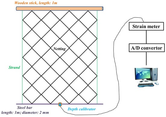 Experiments were conducted in the flume tank at Tokyo University of Marine Sciences and Technology (9.0 m in length, 2.2 m in width, and 1.6 m in depth). This flume tank is a horizontal and circular flume tank where the flow is driven by four contra-rotating impellers using constant-speed hydraulic delivery pumps with impellers 1.6 m in diameter, delivering a flow speed ranging from 0.1 to 2.0 m/s. The netting was cut before the experiment to fit the assembly scale of the net panel frame size. The dimension of all the test netting samples was 1.5 m in in length and 1 m in width. The top part of the netting was attached to a cylindrical wooden rod that measured 1.5 m in length, 15 mm in diameter, and weighed 96.82 g. A steel bar measuring 1 m in length, 2 mm in diameter, and 24.5 g in weight was used to secure the bottom part of the netting. The nylon wire is attached to the netting on both sides, and the overall length was kept at 1.5 m. The depth of the steel bar was proportional to that of the pressure value created by the tiny pressure sensor (P306A-03, SSK, Osaka, Japan), which was mounted in the center of the steel bar. The depth data were created by converting the voltage signal after it had been sent to the strain gauge, computer, and signal converter (Figure 1). During the experiment, the water density was 999.9 kg/, and the water temperature remained at 17.6–18.4 °C.