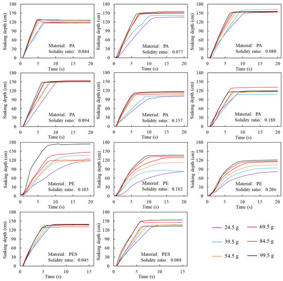 The sinking depth increased as the leadline weight increased, varying from 2.5% to 13.33%. It also increased at the sinking time t < 10 s, while at t > 10 s the sinking depth tended to be constant. For the PA netting, the sinking depth increased as the net solidity ratio increased from 0.044 to 0.094. In contrast, at the solidity ratio greater than 0.094, the sinking depth decreased as the solidity ratio increased. However, for the PE netting, the sinking depth decreased as the solidity ratio increased and increased as the solidity ratio increased for PES netting. The leadline weight was observed to be the critical factor affecting sinking depth. On average, the sinking depth obtained at the leadline weight of 24.5 g was about 4.5%, 46.7%, and 3.6% lower than that obtained at the leadline weight of 99.5 g for the PA, PE, and PES nettings, respectively (Figure 4).