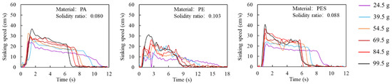 The relationships between sinking speed and time of three material nettings ((left): PA; (middle): PE; (right): PES).