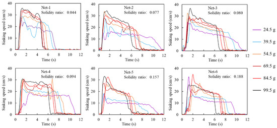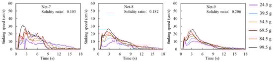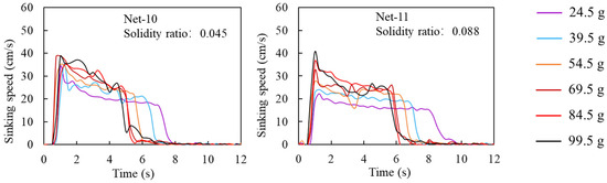The sinking speed of the PE netting increased with a decreasing solidity ratio, ranging from 6.45% to 12.90% (Figure 7). This sinking speed reached its maximum after 3 s and increased as the leadline weight increased. At t > 3 s, the sinking speed decreased as the sinking time increased, with a decreasing rate of 2.31 cm/s. On average, the sinking speed of the PE netting was 20 cm/s at the leadline weight of 24.5 g; it was 59.3% lower than the average sinking speed obtained at 99.5 g (See Figure 7).