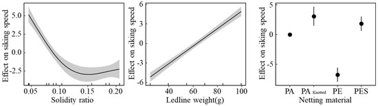 The GAM model revealed a relationship between the average sinking speed and other parameters (Figure 9). The sinking speed decreases as the solidity ratio increases. According to the GAM results, the leadline weight had a linear relationship with sinking speed, as we mentioned above. Furthermore, the sinking speed of PA and PES nettings was greater than that of PE netting. The GAM analysis demonstrated the fluctuation pattern of the influence of several parameters on sinking speed.