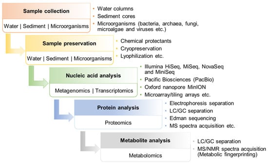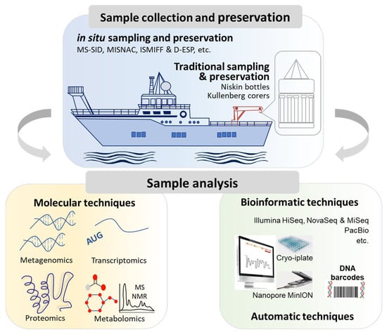 A typical workflow of the scientific studies on marine microorganisms includes sample collection, preservation, preparation, and analyses (Figure 2), which is described in more detail in the subsequent sections. The primary focus of the research is on the molecular biological techniques, particularly the in situ field investigations in the omics era.