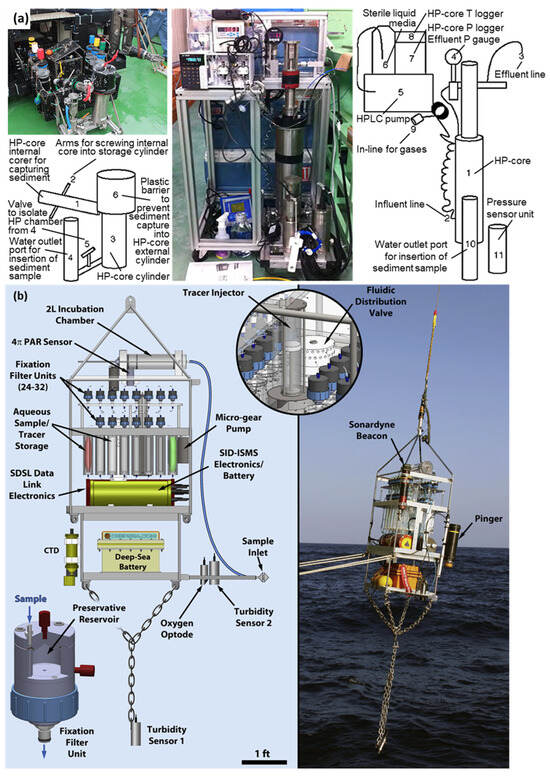 (a) The high-pressure (HP) core. (b) The microbial sampler submersible incubation device (MS-SID) equipped with a conductivity, temperature, and depth (CTD) instrument; two turbidity sensors; an oxygen optode; a synchronous digital subscriber line (SDSL); and a photosynthetically active radiation (PAR) sensor. Adapted with permission from references [21,23]. Copyright 2017, the authors. Frontiers in Microbiology, published by Frontiers Media S.A and 2016 Elsevier Ltd.