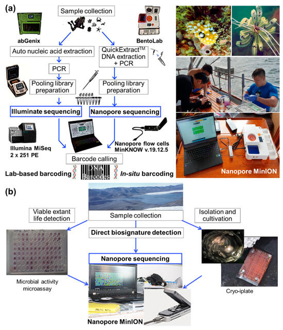 (a) A typical laboratory-based next-generation sequencing and in situ field sequencing workflow. (b) A MICRObial life-detection platform for microorganisms in remote and extreme environments. Adapted with permission from references [61,62]. Copyright 2020, the authors. Genes published by MDPI, Basel, Switzerland, 2017, the authors. Frontiers in Microbiology, published by Frontiers Media SA, Switzerland.
