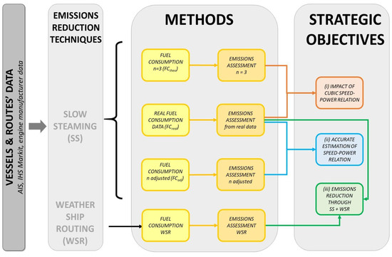- Impact of the cubic speed‒power relation: Firstly, fuel consumption and emissions are theoretically calculated by using 3 as an exponent value; secondly, real emissions are assessed thanks to the availability of real fuel consumption data. The results are compared in order to assess the impact of the cubic relation.