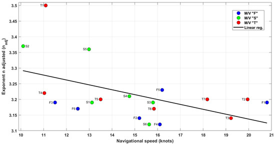 - Accurate estimation of the power relation by using real fuel consumption data (i.e., the new n exponent adjusted): By using real fuel consumption data, the n exponent derived from these real data is calculated (), and it is used afterwards for the theoretic assessment of fuel consumption. The real data are compared with the theoretical data obtained with the newly adjusted exponent.