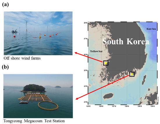 Map showing (a) the offshore wind farm (Gochang-gun and Buan-gun in North Jeolla Province, Republic of Korea) and (b) Tongyeong Megacosm Test Station (Korea Institute of Ocean Science and Technology, Tongyeong-si, Gyeongsangnam-do, Republic of Korea).